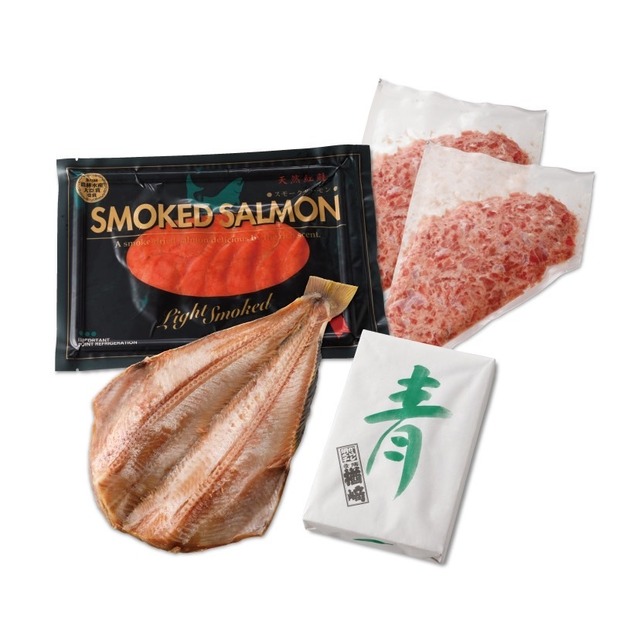 ※海美(しび)ちゃんと読みます。 〝ツナキチセレクト〟の入り口に♪ あなただけのご褒美で笑顔&口福になりますように♪ 青唐辛子めんたいこ切子200g×1 縞ほっけ×1 天然インドマグロたたき200g×2 天然紅鮭スモークサーモン×1 ※冷凍便でお届けします。